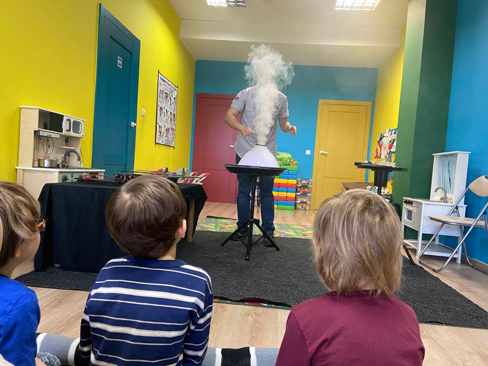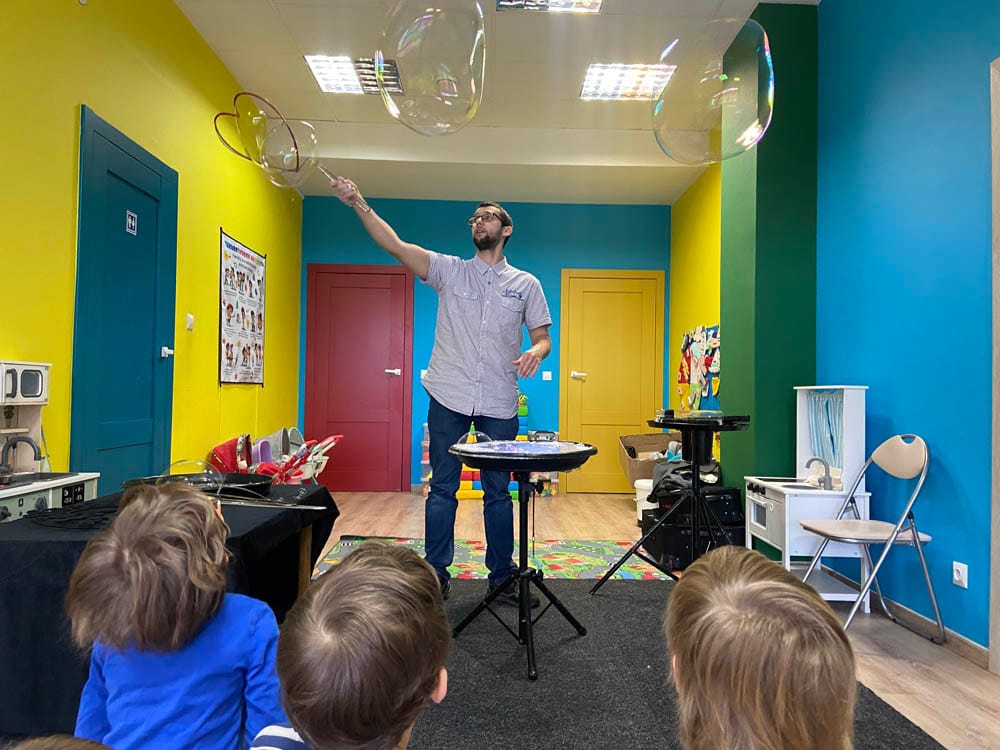 Już od pierwszych chwil dzieci z zapartym tchem obserwowały delikatne, mieniące się tęczowymi kolorami bańki, które unosiły się w powietrzu, tworząc bajkowy spektakl. Jednak to dopiero początek magii! Niektóre bańki wypełniły się gęstym, tajemniczym dymem, dzięki czemu wyglądały jak unoszące się obłoczki. Inne niespodziewanie zamieniły się w płonące kule, wprawiając dzieci w prawdziwy zachwyt!